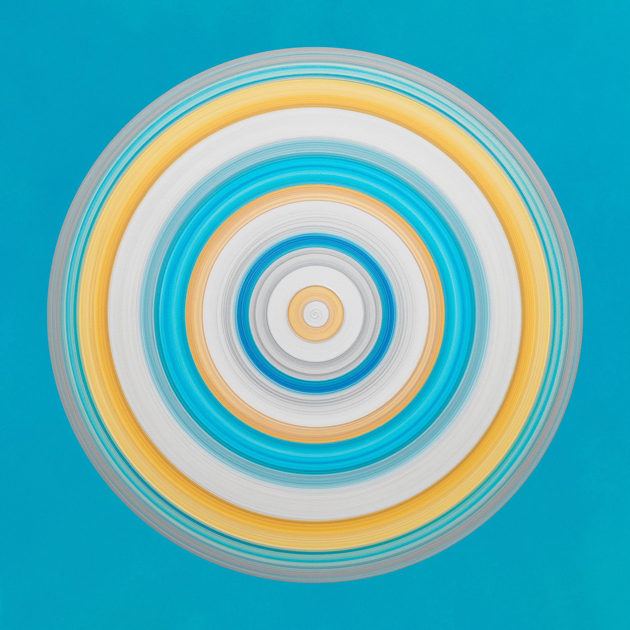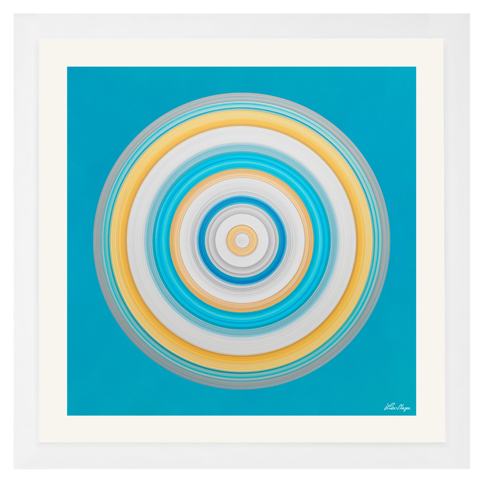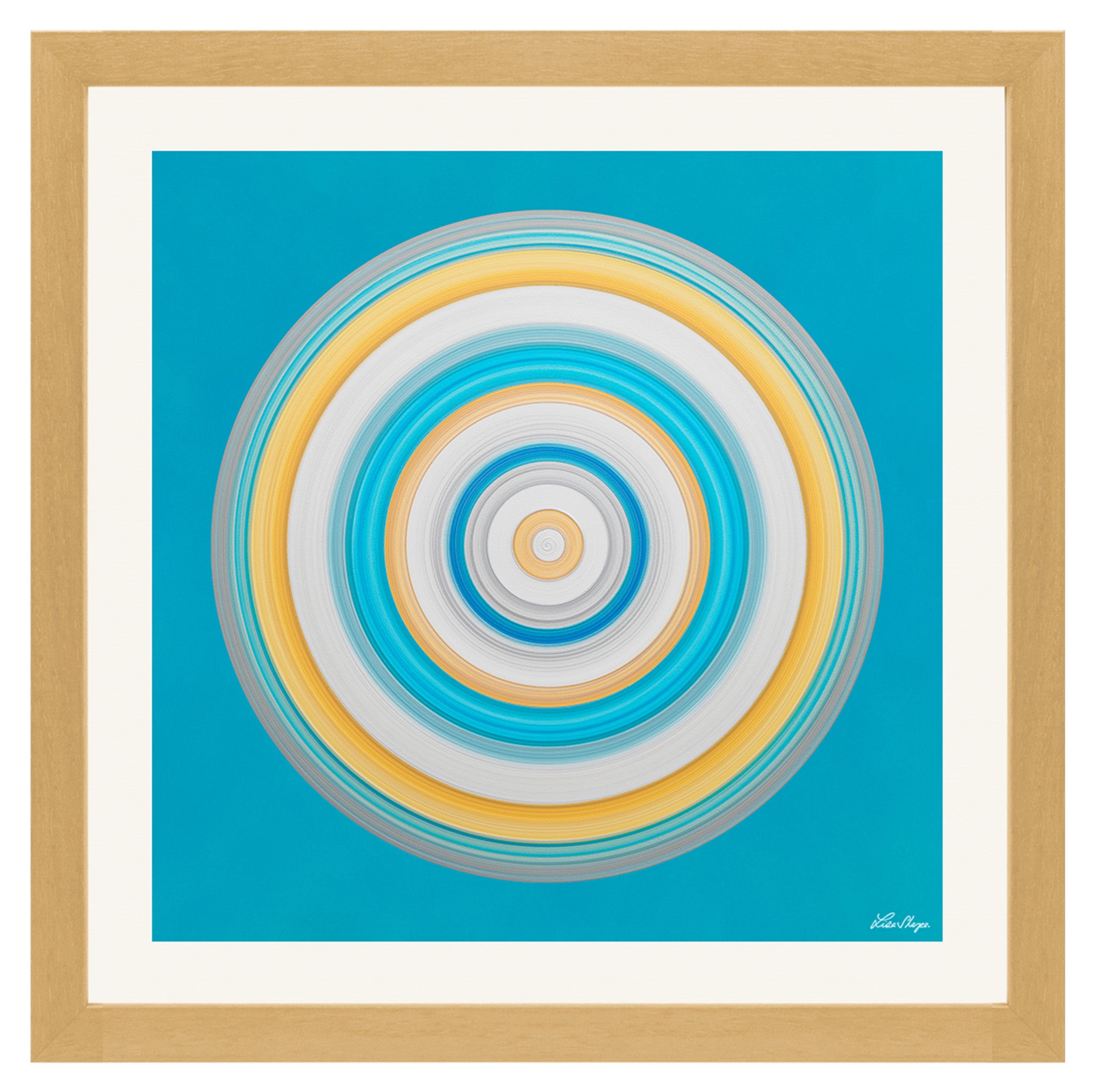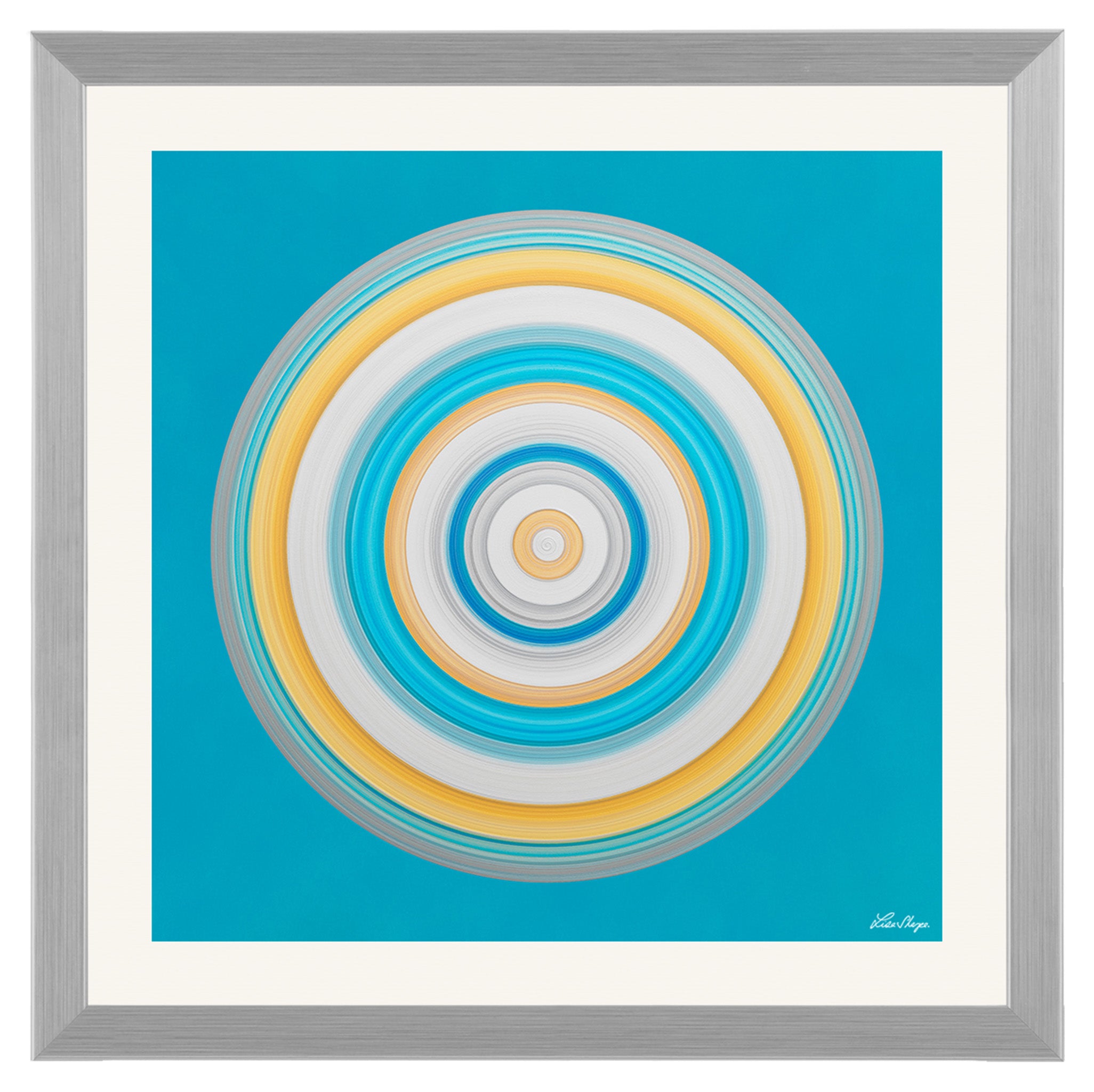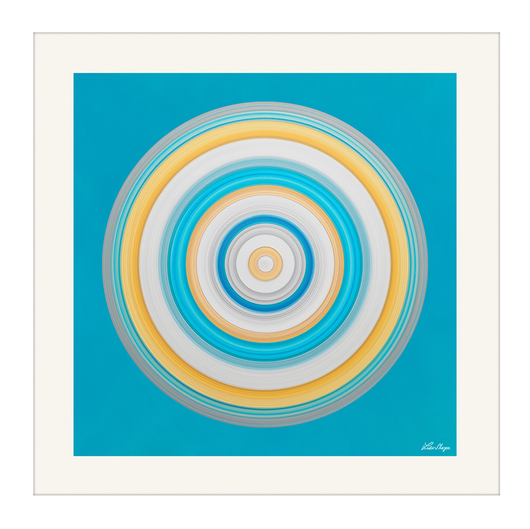 “Alchemy of Light” is the continuation of an earlier work titled Perfect, a painting created to hold healing energy clarity and deep inner strength. In this new expression the soft pale golds and gentle whites evoke serenity and renewal, while the turquoise tones bring in emotional balance and a sense of protective ease. The silver band encircling the work offers grounding clarity and quiet strength.