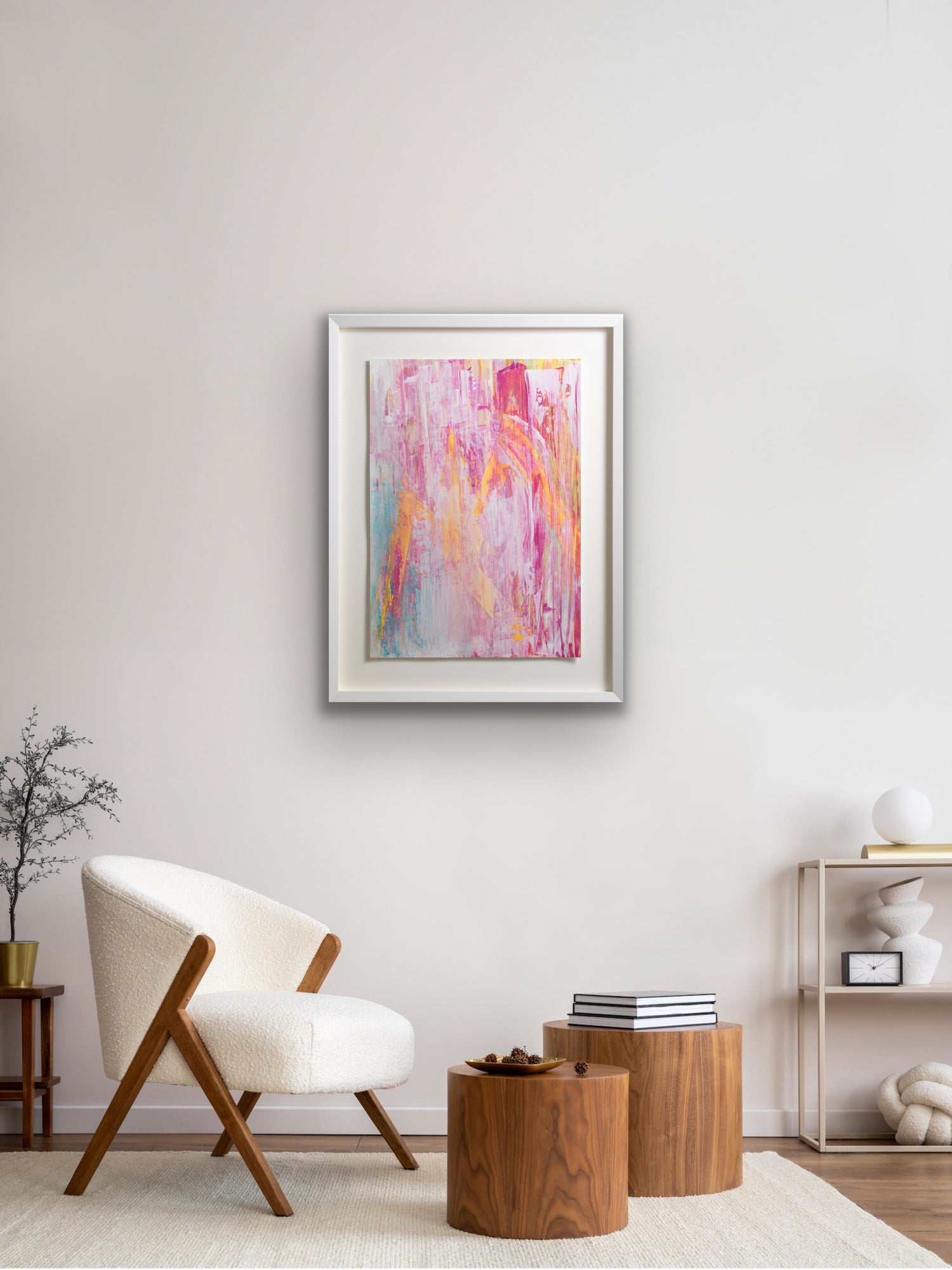 The soft interplay of pinks, whites, and turquoise creates a sense of harmony and hope, while the entire painting radiates an ethereal glow that draws you in, inviting quiet reflection and wonder. These colors, chosen with intention, vibrate with the frequencies of love, clarity, and renewal, creating a space where the viewer can feel both grounded and inspired.