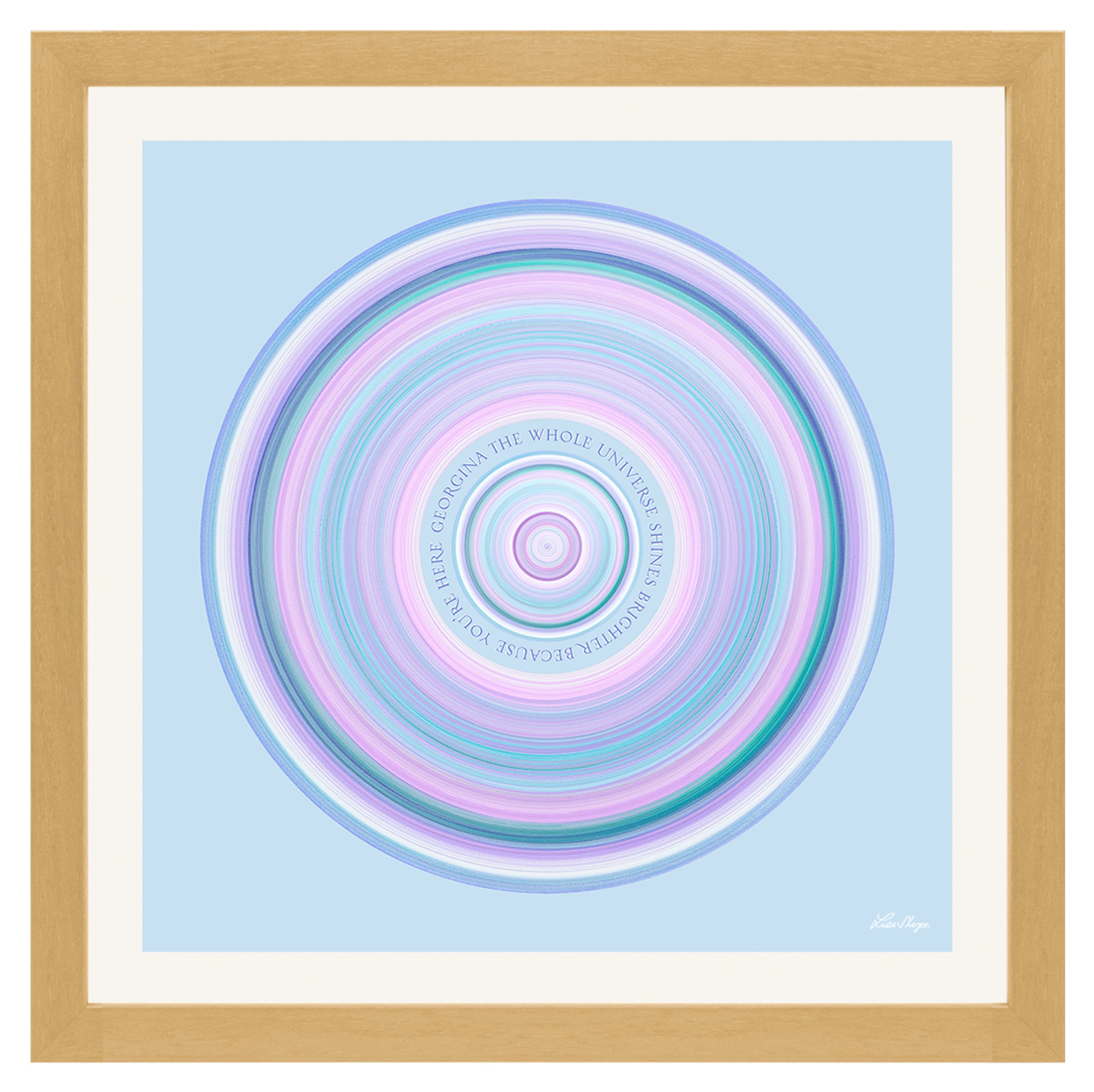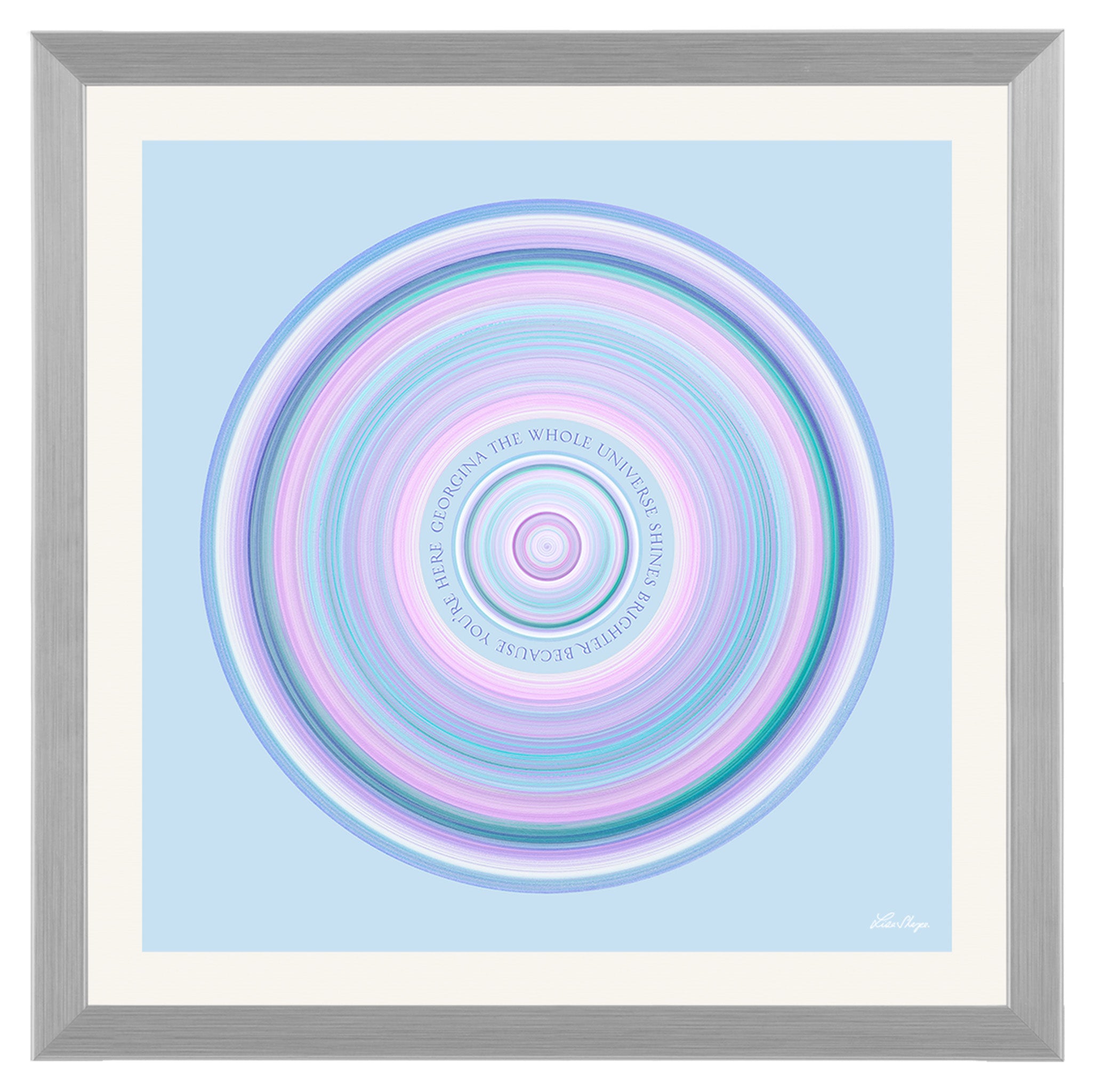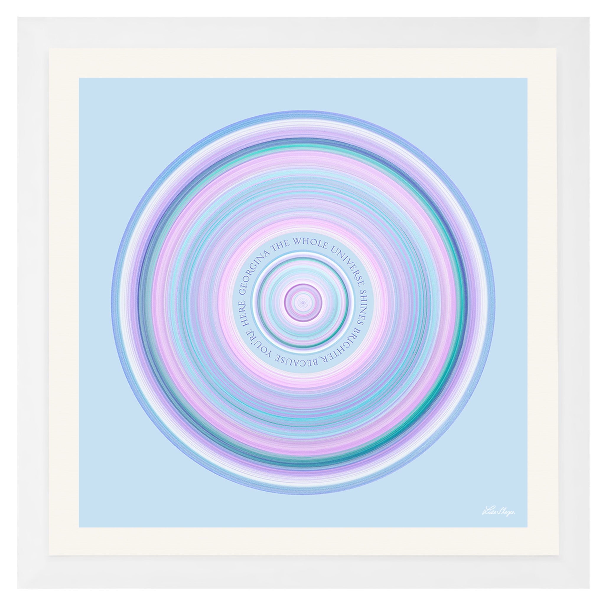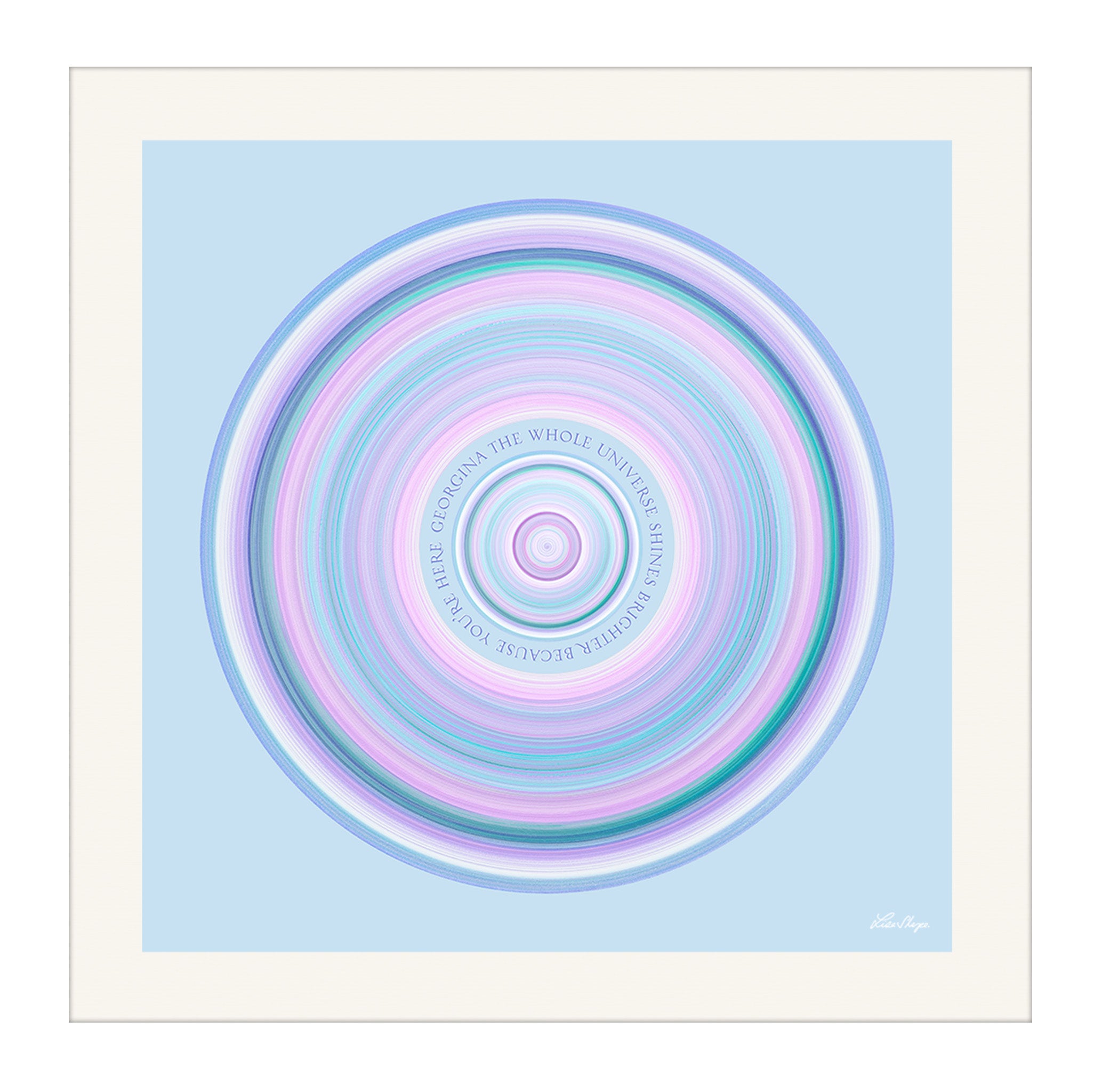 A softly luminous high-vibrational artwork in gentle lilac, serene aqua and pale sky-blue — a colour palette chosen to evoke calm, purity and an unmistakable feeling of being deeply loved. Created to surround your loved one with a tender, expansive frequency every day.